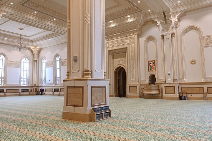 L’interno della moschea è altrettanto impressionante. Il tappeto principale, realizzato artigianalmente, copre l’intera sala di preghiera. I lampadari in cristallo aggiungono un tocco di lusso e illuminano lo spazio con una luce calda e soffusa.
